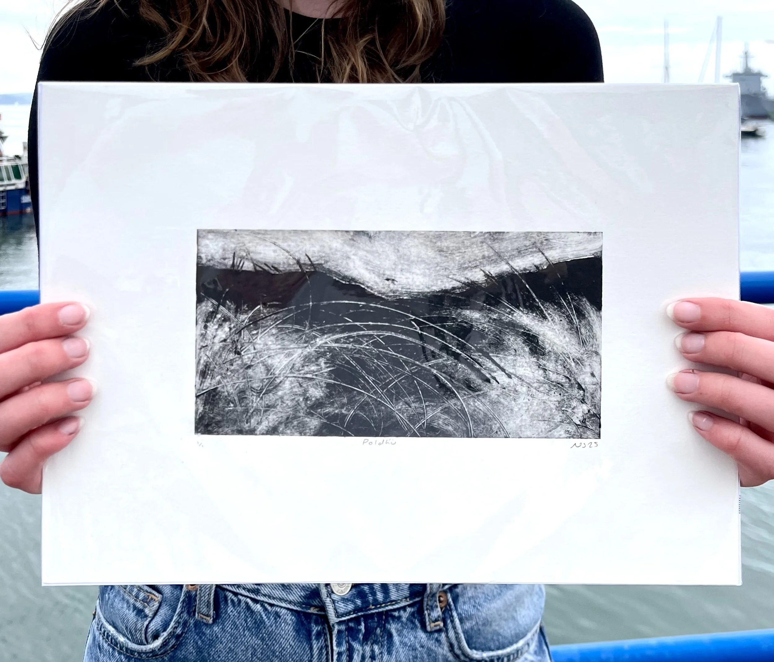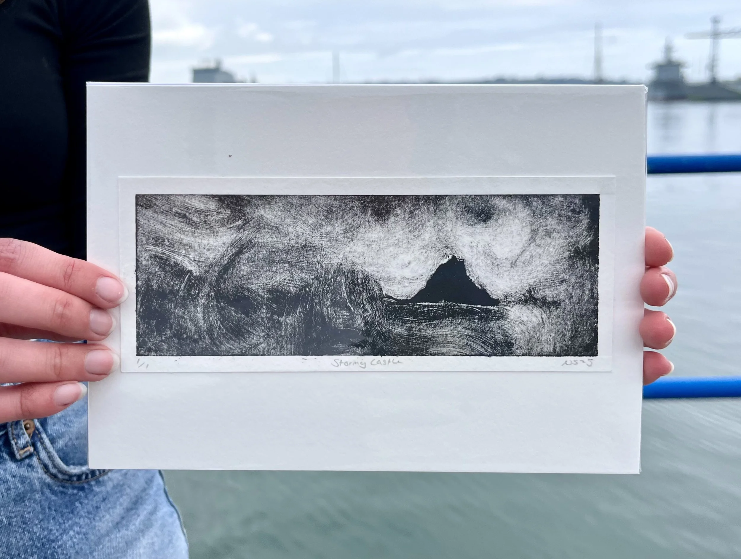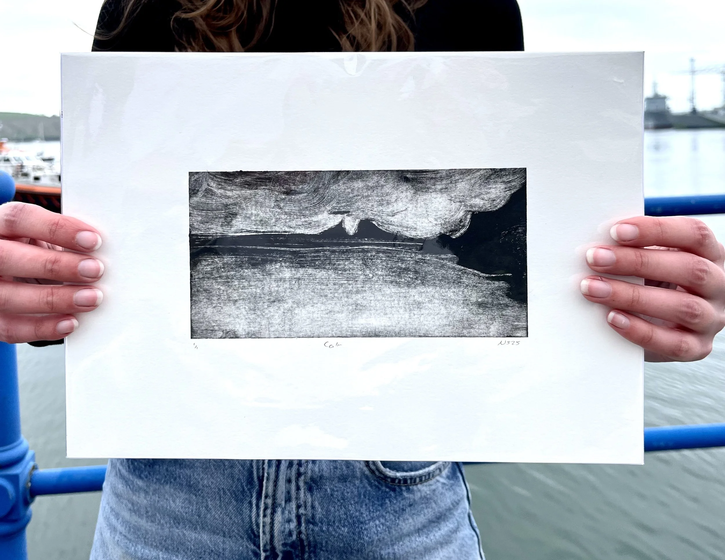 Niamh’s monotypes are all one of a kind original prints. She creates them by wiping away ink by hand to create light, giving the pieces an organic and rugged atmosphere